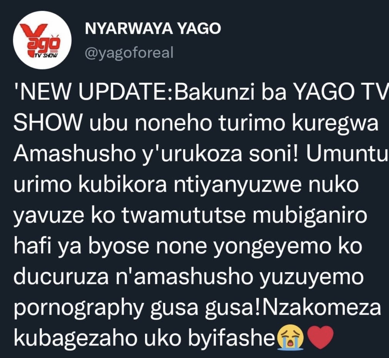 Umunyamakuru Yago uherutse kugira ikibazo cyo guhagarikirwa cano ye ya YouTube izwi ku izina rya Yago Tv show yahaye andi makuru abafana be ndetse n’abafana ba Yago Tv show.