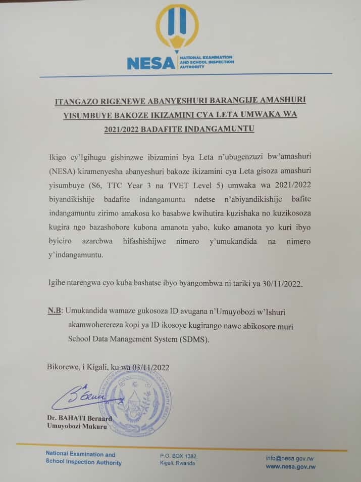 Mu itangazo dufitiye kopi rivuga ko ikigo k’igihugu gishinzwe ibizamina NESA kimenyesha abanyeshuri bose biyandikishije kugirango bakore ibizamini bisoza ayisumbuye S6 cyangwa TVET badafite amarangamuntu cyangwa abazifite ariko ziriho amakosa basabwe kwihutira kuzishaka no kuzikosora kugirango bazabashe kureba amanota yabo.