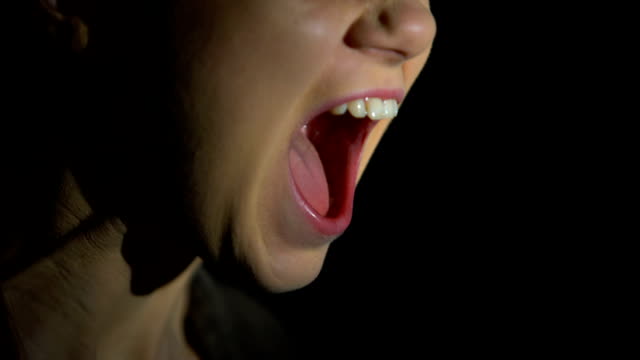 Face of female screaming against dark background, psychological problems