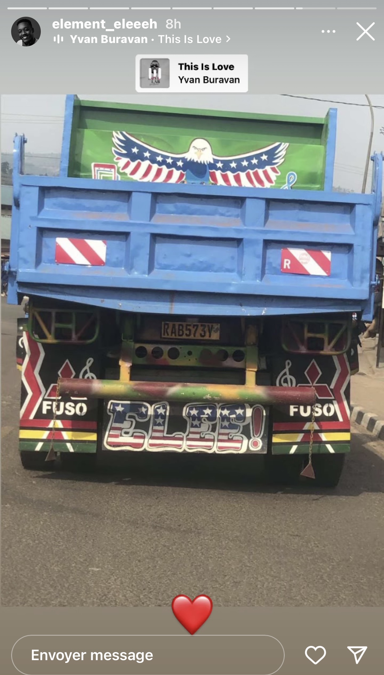 Producer Eleeeh yagaragaje amarangamutima ye nyuma yo kubona ikamyo yanditseho amazina ye. Abinyujije kuri story ya instagram ye, Eleeeh yashyize hanze ifoto igaragaza iyi kamyo maze ayiherekesha akarango k’umutima (❤️).