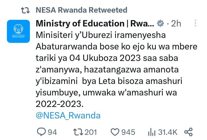 Ikigo cy’Igihugu gishinzwe Uburezi ku bufatanye na NESA, batangaje igihe amanota y’abanyeshuri bakoze ikizamini gisoza amashuri yisumbuye 2022-2023.