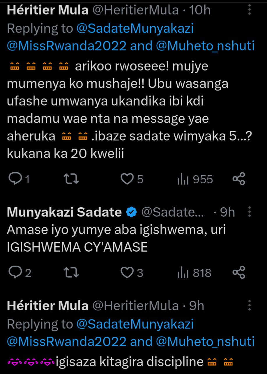 “Amase iyo yumye aba igishwema, uri IGISHWEMA CY’AMASE” Munyakazi Sadate yagutukiye abasore bo kuri Twitter bigize inshyanutsi bashatse kumushyanukaho ubwo yari ari kubwira amagambo yihumure Miss Muheto Divine wari wakoze impanuka bikitirirwa amaco yo gusaba happiness.