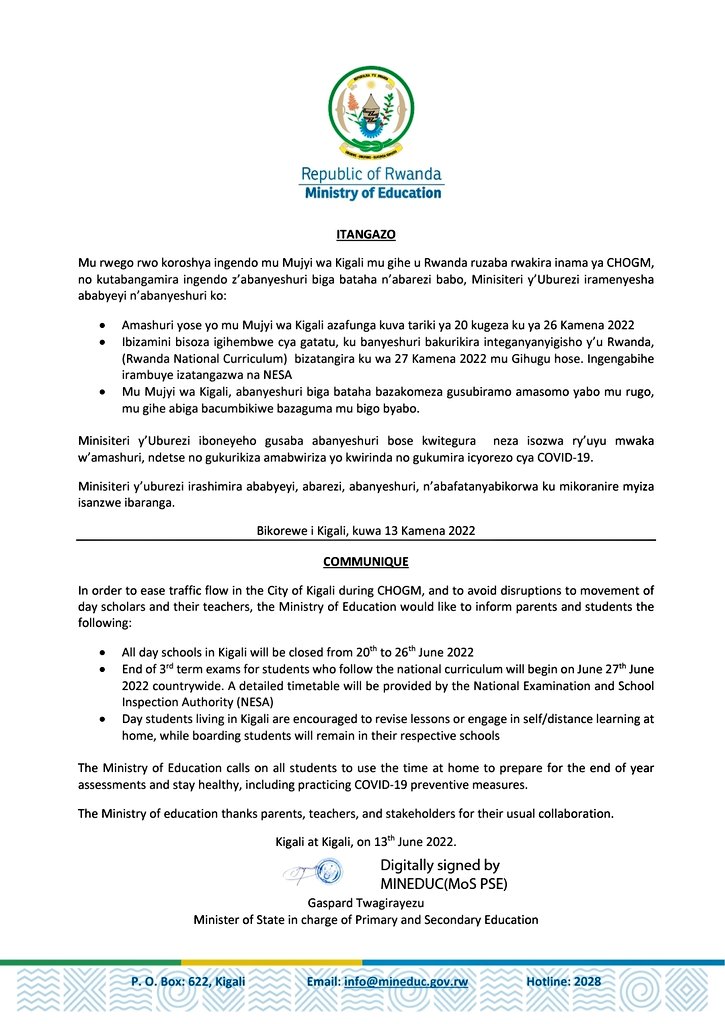 Ni itangazo risohowe na REB rivuga ko amashuri muri Kigali agiye kuba ahagaze mu gihe u Rwanda rugiye kwakira inama ya CHOGM.