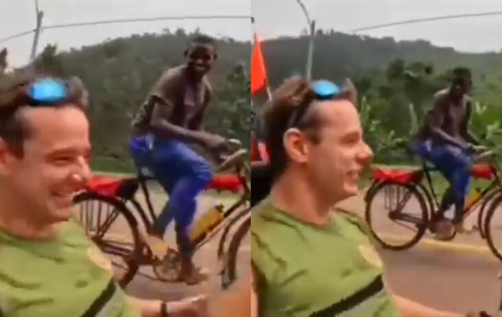 Amashusho ateye ubwuzu y’umuzungu aganira n’umunyarwanda mu rurimi rw’icyongereza barimo banyonga igare akomeje kwishimirwa na benshi