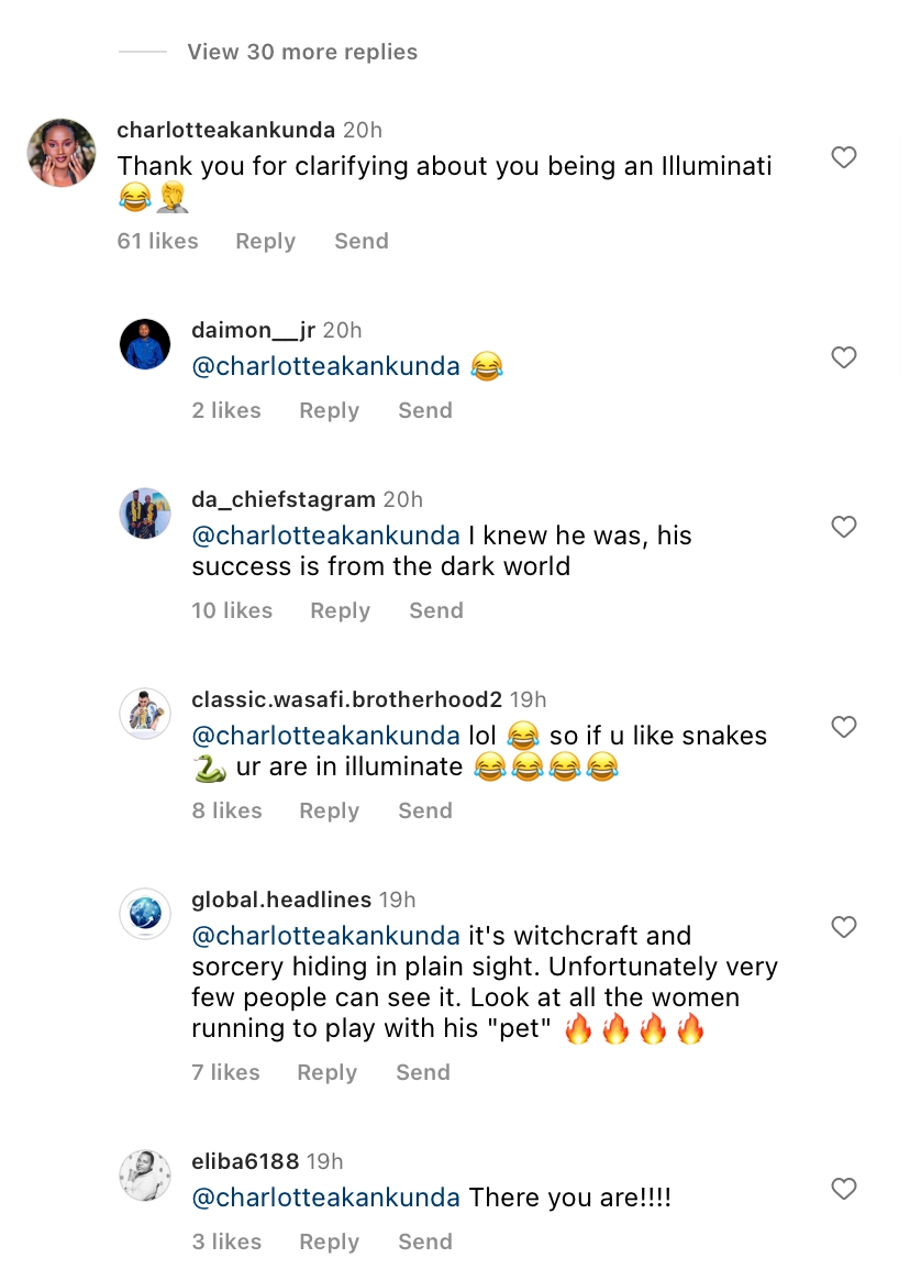 Nk’uwitwa Charlotte Akankunda yagize ati:” urakoze kutwereka ko uri muri Illuminati” , mu gihe uwitwa da chiefstagram we yagize ati:” narimbizi ko akorana nayo , ubutsinzi bwe buva mu isi y’umwijima”