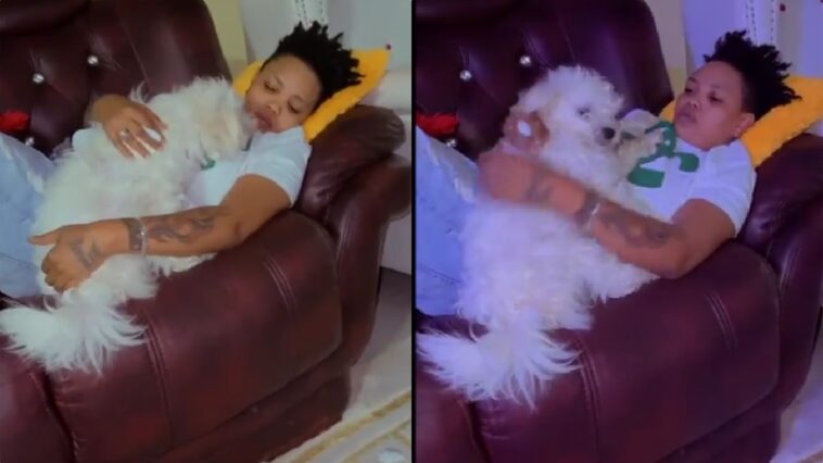 Ni amashusho Dj Brianne yasangije abamukurikira ku rukuta rwe rwa X, aho yari aryamye mu ntebe, imbwa ye imuryame mu gituza.