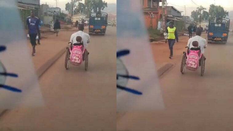 Mu mujyi wa Uganda hagaragaye umugabo ugendera ku kagare ajyanye umwana we ku ishuri.