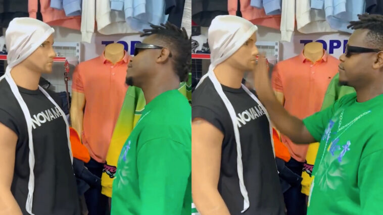 Amashusho y’umuhanzi Bruce Melodie ari gukina n’igipupe bacururizaho imyenda muri Amerika yasakaye imbuga nkoranyambaga