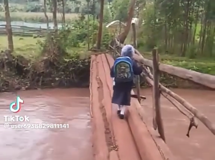 Uyu mwana wanyuraga kuri iki kiraro yari yambaye imyenda y’ishuri ndetse ahetse n’igikapu ubona ko yashyize ubuzima bwe mu kaga agiye ku ishuri.