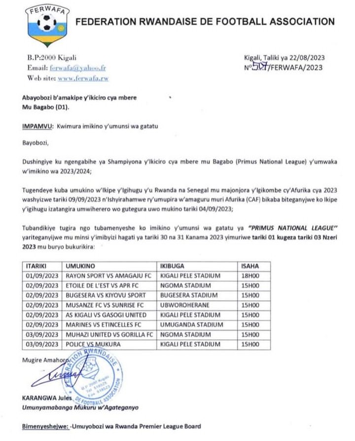 Ishyirahamwe ry’umupira w’amaguru mu Rwanda ‘FERWAFA’ ryashyize hanze itangazo rimenyesha amakipe yo muri shampiyona y’icyiciro cya mbere mu bagabo ko hari imikino yahinduriwe umunsi.