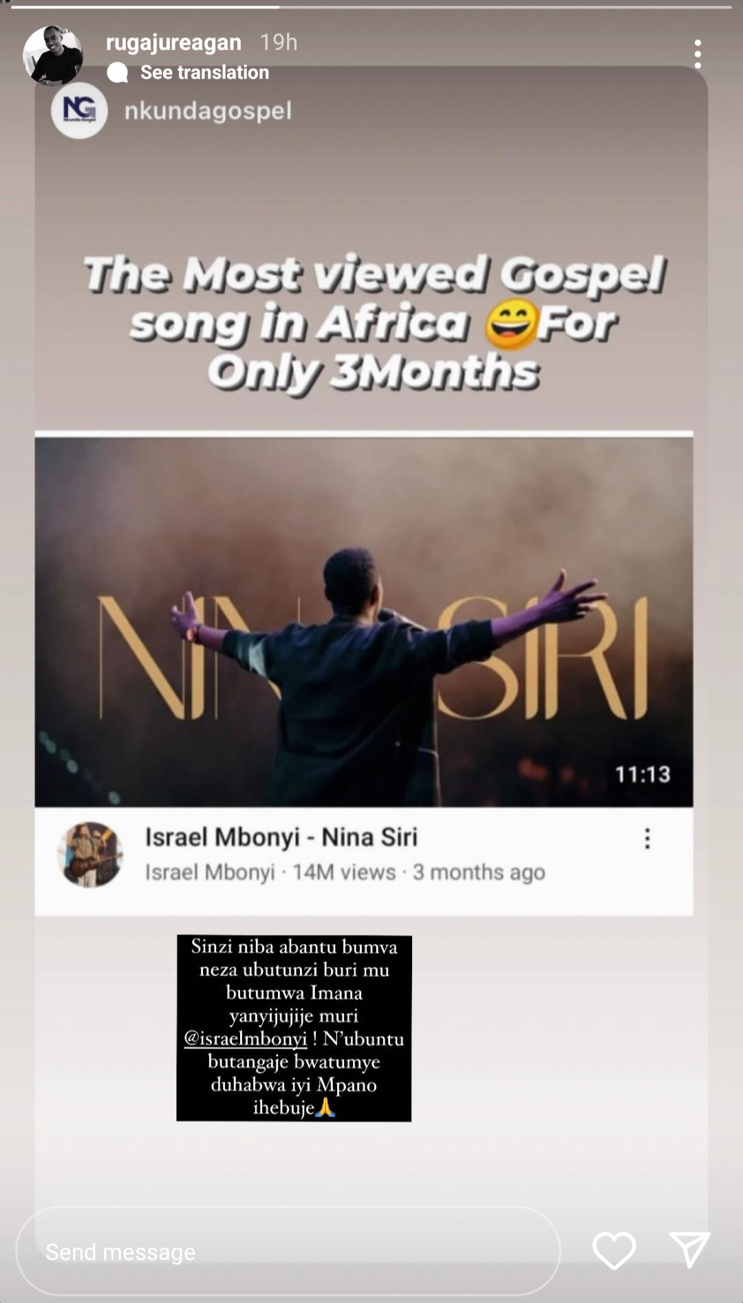 Abinyujije kurukuta rwe rwa Instagram ahashirwa ubutumwa bumara amasaha 24 yashyizeho ifoto igaragaza uburyo indirimbo y’umuhanzi Israel Mbonyi yitwa Nina Siri ikomeje kurebwa cyane mu gihe gito.