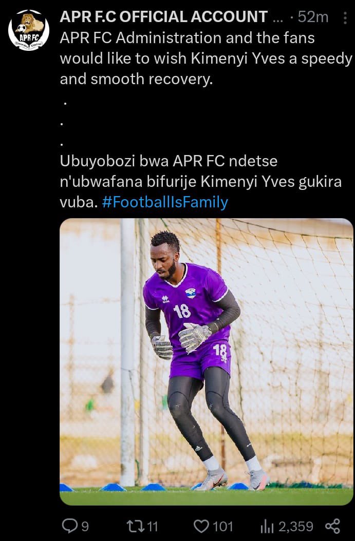 Ubuyobozi bwa APR FC bubinyujije ku mbuga nkoranyambaga z’ikipe, bwagize buti “Ubuyobozi bwa APR FC ndetse n’ubwabafana bifurije Kimenyi Yves gukira vuba.”