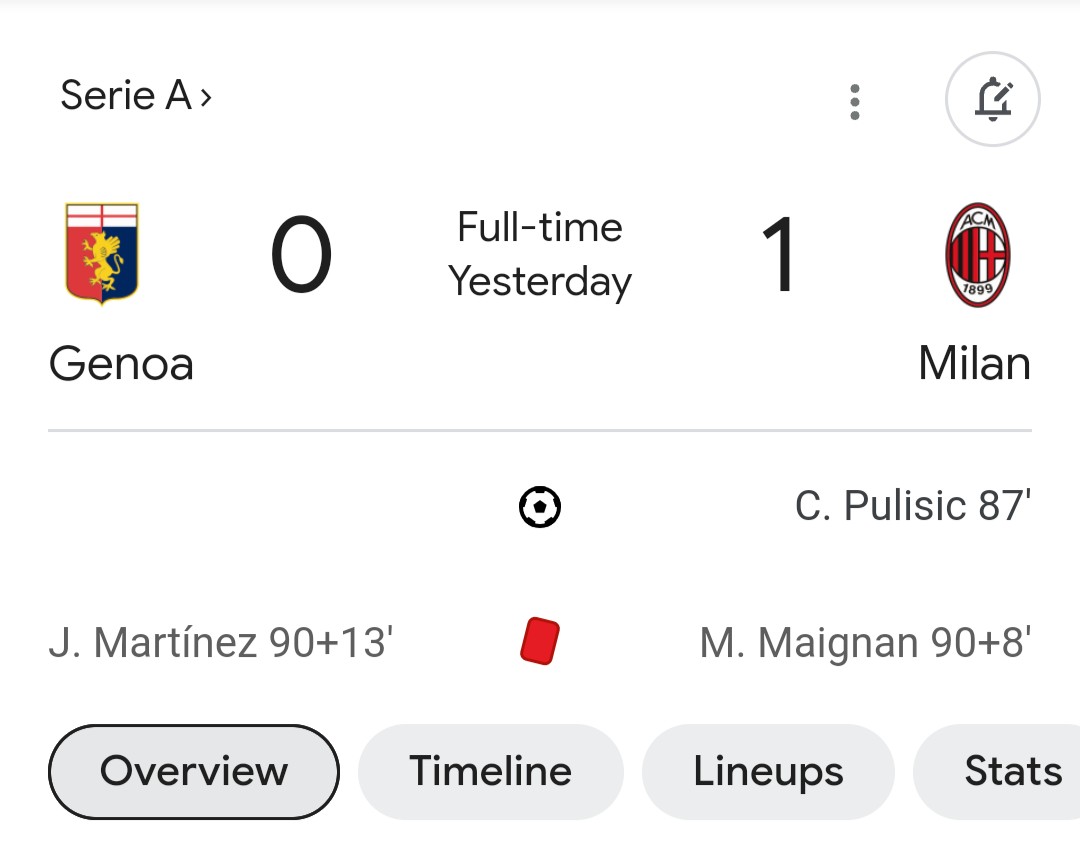 Ku ruhande rwa Genoa umuzamu Josep Martinez yahawe umutuku ku munota wa 90+13 mu gihe MIKE MAIGNAN wa Milan we yayiriye ku munota wa 90+8.