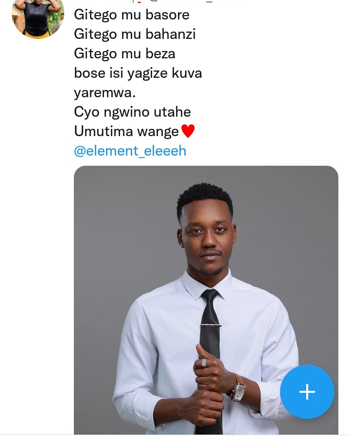 Umwe mu bakobwa bakoresha Twitter yihandagaje yandika imitoma yifashishije ifoto ya Element iherekejwe n’amagambo agira ati”Gitego mu basore, Gitego mu bahanzi ,Gitego mu beza bose isi yagize kuva yaremwa, Cyo ngwino utahe umutima wange.”