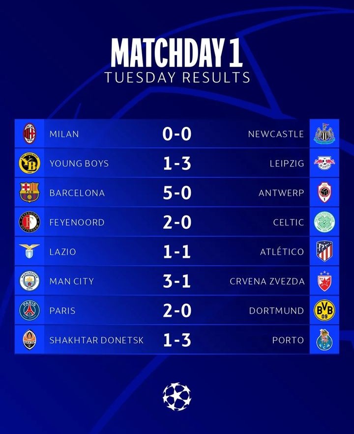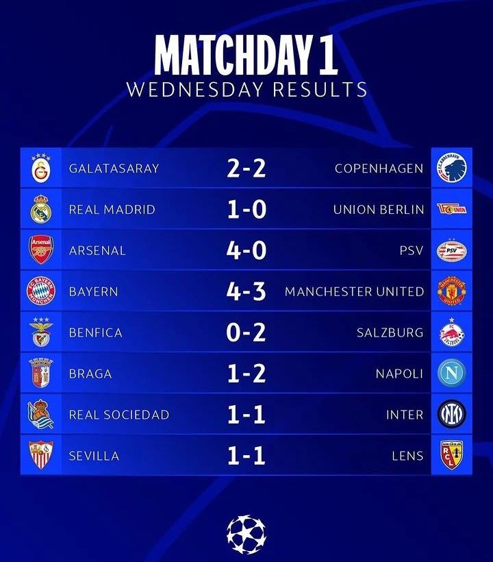 Mu mikino yabaye ku mugoroba wo kuri uyu wa Gatatu tariki 20 Nzeri 2023, ikipe ya Arsenal yatsinze PSV ibitego 4-0, naho Manchester United itsindwa na Bayern Munich ibitego 4-3.