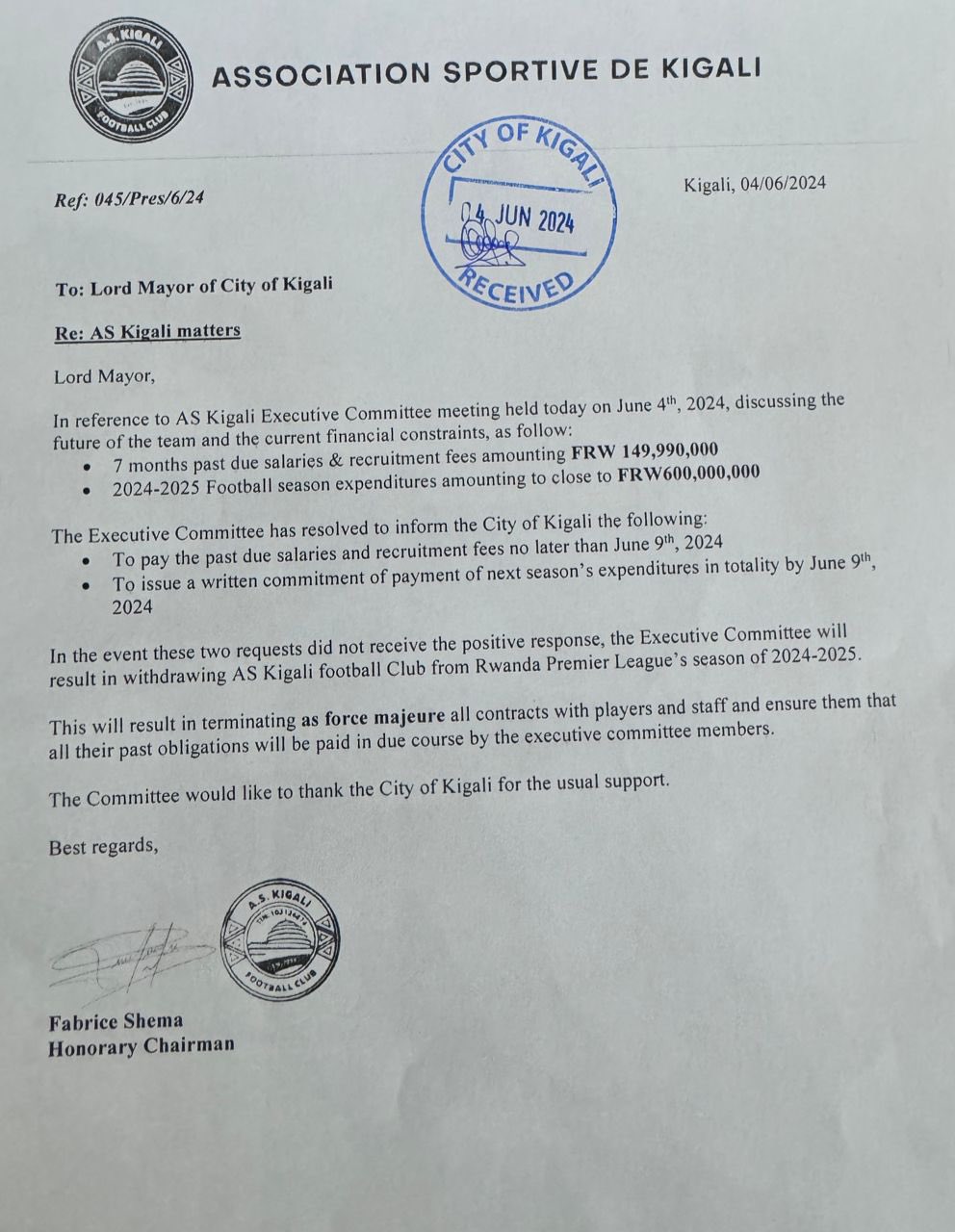 Ni ibaruwa yasinyweho n’Umuyobozi w’Icyubahiro wa As Kigali, Shema Fabrice aho yasabye Umujyi kwishyura ibirarane by’amezi 7 by’umwaka w’imikino ushize wa 2023-24 ndetse n’amafaranga izakoresha mu mwaka w’imikino utaha