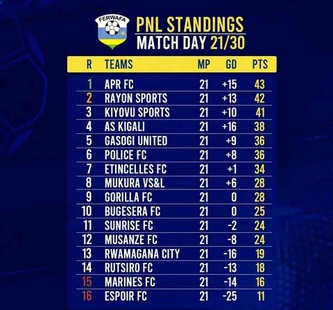 Umunsi wa 21 wa shampiyona y’ikiciro cya mbere usize urutonde rwa shampiyona ruhagaze gutya: