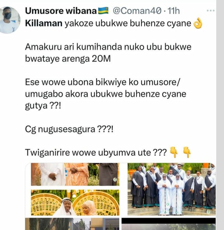 Cyane cyane abakoresha urubuga rwa X rwahoze ari twitter, bakomeje kugaya Killaman bamubwira ko atakabaye yarasesaguye bigeze aha, ahubwo ko aho gukoresha ubukwe bwa million 43 yari kuyaguramo ikibanza ubundi agakoresha ubukwe bwa million 2 budahenze cyane.