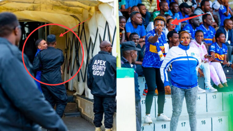 Umutoza ntiyihanganiye bamwe mu bafana barimo Malayika ahubwo nawe yiyambuye umwambaro w’ubutoza ajya gusubizanya nawe bisaba ko abashinzwe umutekano bajya gukura umufana mu nzira.