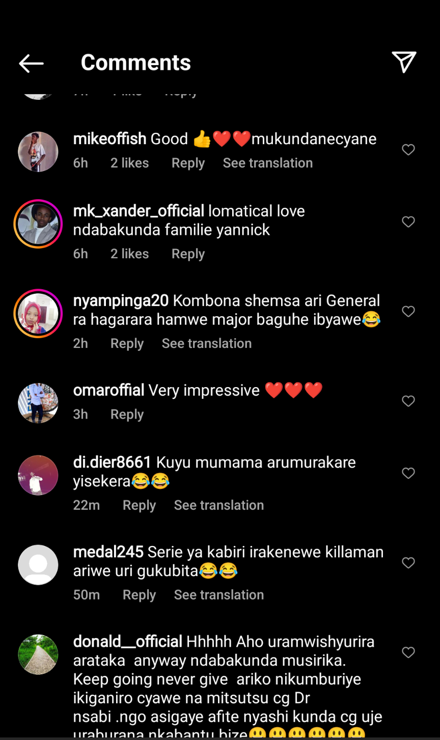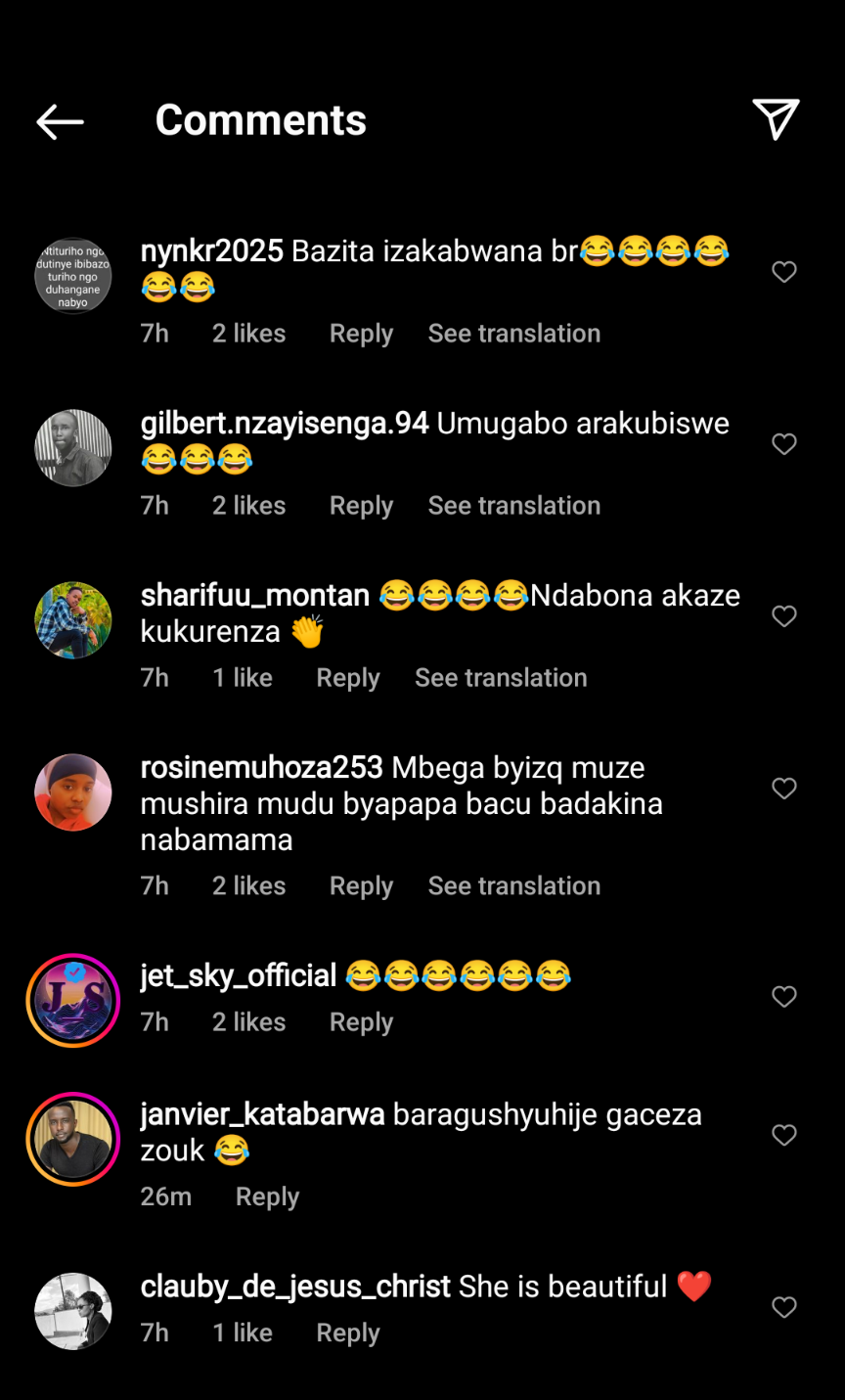 Mu mashusho yagaragaye ku mbuga nkoranyambaga z’uyu munyarwenya ukunzwe na benshi mu Rwanda yamugaragaje ari gukina n’umugore we umukino benshi bazi ku izina ryo gushyushyanya aho umuntu atega ibiganza byombi maze undi nawe agakubita yaswata nawe agatega ibiganza.