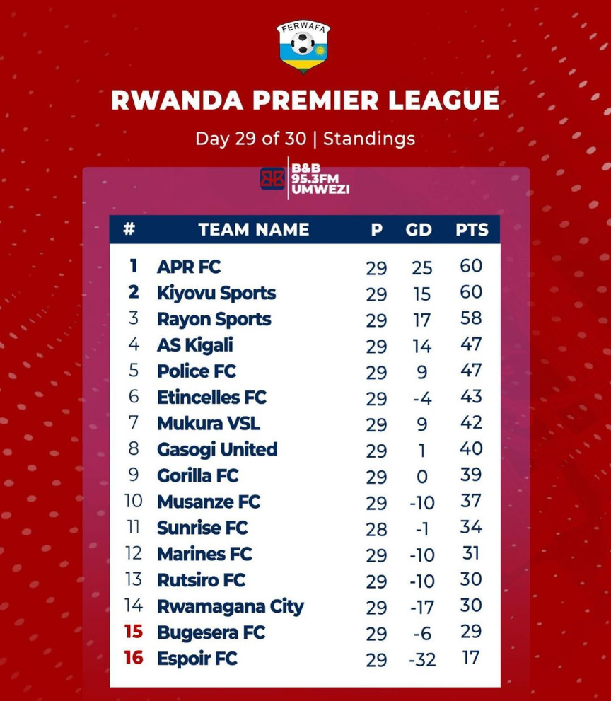 Bamwe bararira abandi baraseka: Menya uko urutonde rwa shampiyona y’u Rwanda ruhagaze mu gihe habura umukino umwe ngo irangire
