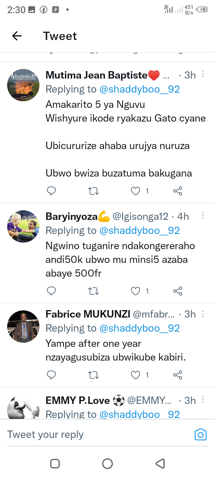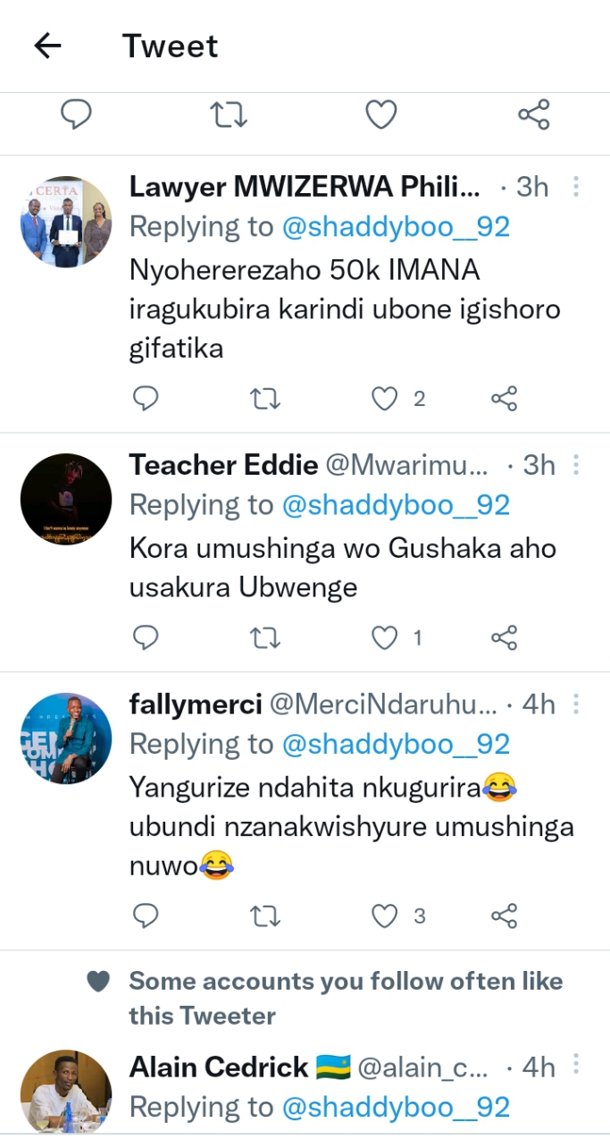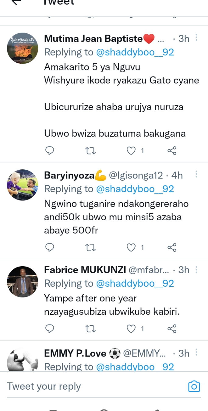 Shaddyboo yanditse ati “Abachou Mfite 250k( Ibihumbi magana abiri na mirongo itanu) mwampaye umushinga udahenze nakora , waba wunguka cga utunguka.Murakoze”.