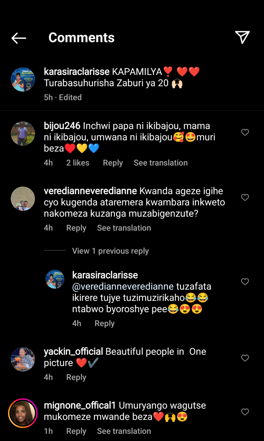 Abinyujije ku mbuga nkoranyambaga ze umuhanzikazi Karasira Clarisse yagaragaje umuryango we maze abwirwa amagambo yuje urukundo n’abakunzi be.
