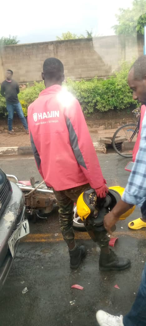 Iyo modoka igonganye na Moto ariko kubw’amahirwe nta muntu uhagiriye ikibazo.