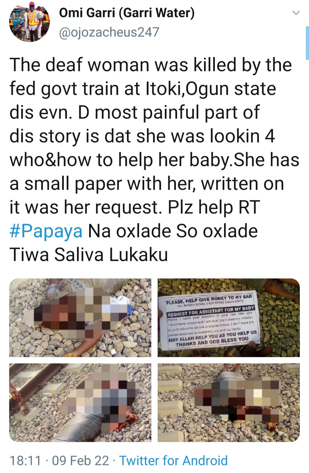 Umugore ufite ubumuga bwo kutumva yagonzwe na gari ya moshi ubwo yari ku muhanda usaba imfashanyo kugira ngo abone icyo agaburira umwana be.