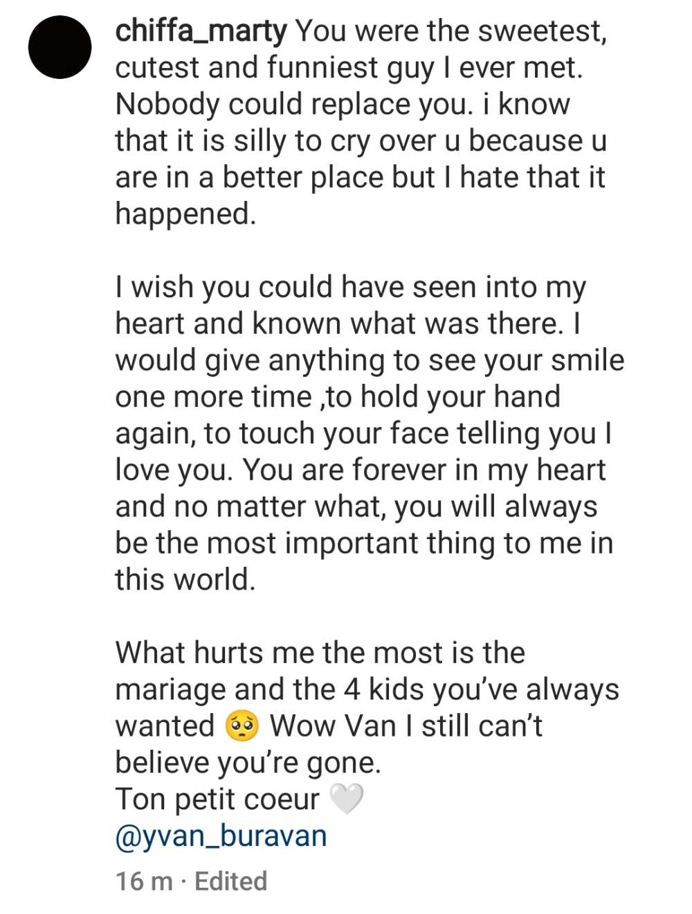 Mu magambo ye yagize ati “Wari umusore mwiza udasanzwe twahuye mu buzima. Nta wagusimbura,ndabizi ko ntakabaye ndira kubera wowe kuko nzi ko uri aheza, biri kwanga bikambaho. Iyaba byashobokaga ngo urebe mu mutima wanjye wenda umenye ikirimo.”