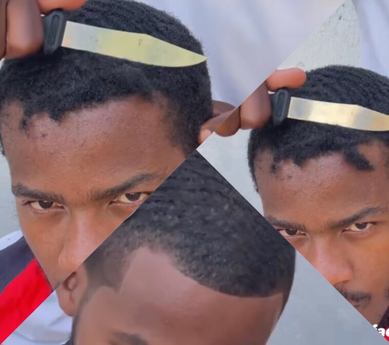 Mu mashusho yacaracaye ku mbuga nkoranyambaga zitandukanye yagaragaje umugabo bari ku mwogoshesha icyuma barangije baranamuconga ku buryo umubonye utamenye ko ar’icyuma cyamwogoshe.