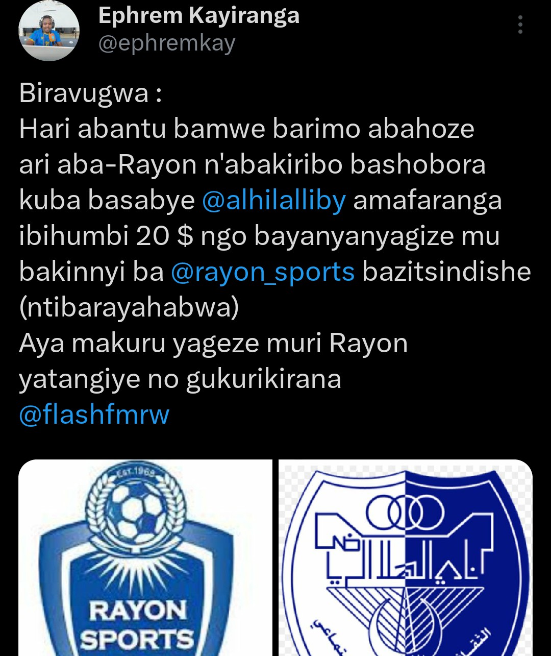 Abinyujije ku rukuta rwe rwa X yahoze yitwa Twitter, Ephraim yagize ati: “Hari abantu bamwe barimo abahoze ari aba-Rayon n’abakiribo bashobora kuba basabye Al Hilal Benghazi amafaranga ibihumbi 20 $ (arenga miliyoni 20 z’amanyarwanda) ngo bayanyanyagize mu bakinnyi ba Rayon Sports bazitsindishe (ntibarayahabwa)”