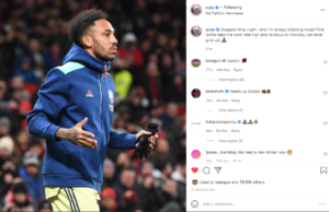 Kapiteni w’ikipe ya Arsenal Pierre Emerick Aubameyang amaze gushyira ku rukuta rwe rwa Instagram amagambo asaba imbabazi abafana ba Arsenal nyuma y’intsinzwi y’ikipe abereye kapiteni yaraye itsinzwe n’ikipe ya Manchester United ibitego 3-2.
