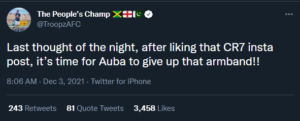 Benshi mu bafana b’ikipe ya Arsenal ntago bishimiye iki kintu aho hari umufanaw’inshuti ye Troopz wasabye ko yakakwa igitambaro cy’ubu kapiteni gusa ibi byatewe n’amarangamutima ndetse n’akababaro yaratewe no gutsindwa na Manchester United.