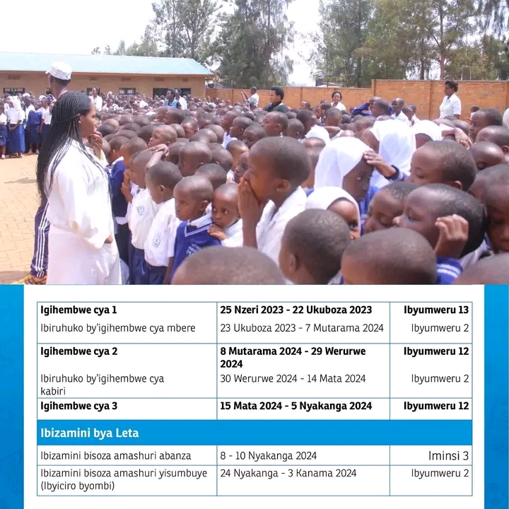 Minisiteri y’Uburezi yatangaje Ingengabihe y’Umwaka w’Amashuri 2023 – 2024, Igihembwe cya mbere cyizatangira tariki 25 Nzeri 2023, cyirangire tariki 23 Ukuboza 2023.