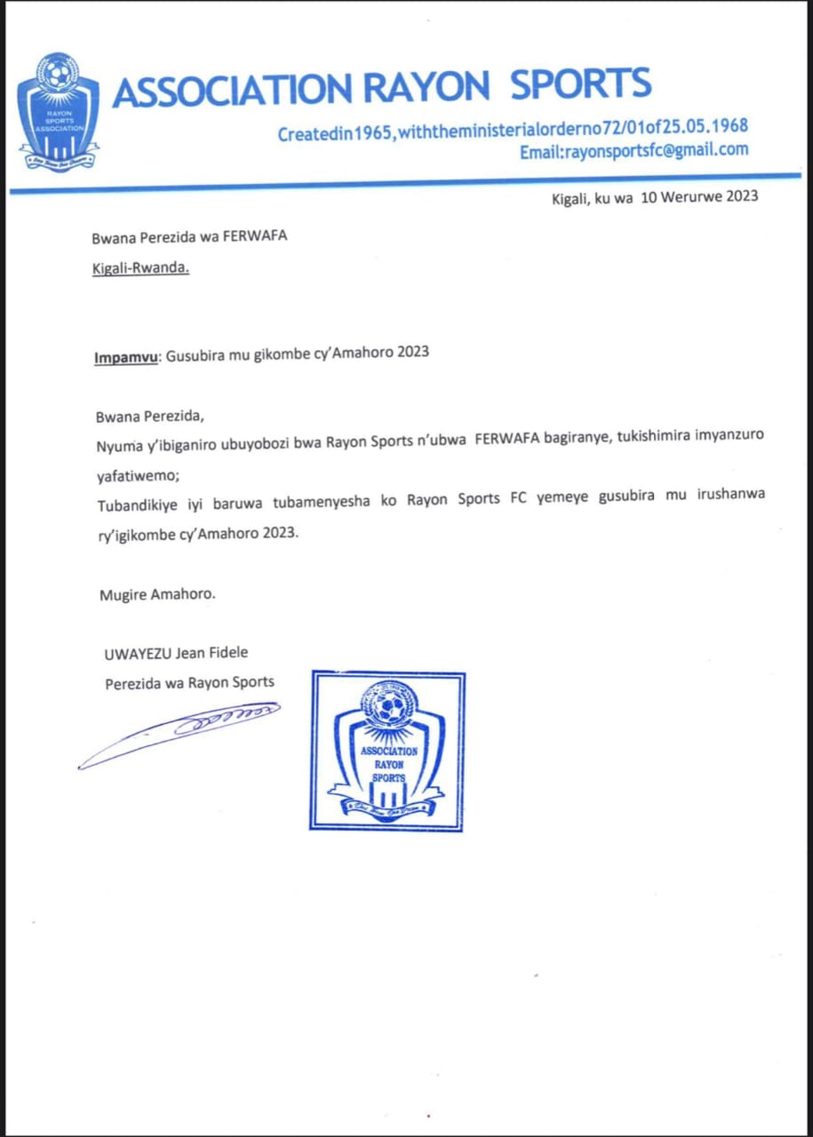 Ubuyobozi bwa Rayon Sports bwandikiye FERWAFA buyisaba ko nyuma y’ibiganiro, ubu bamaze kwemera kugaruka mu irushanwa.
