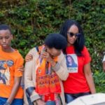 Miss Aurore Kayibanda n’abo mu muryango we harimo na mama we barize barahogora ubwo bashyiraga indabyo ku mva y’umuhanzi Hirwa Henry(Amafoto)