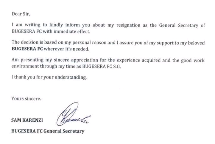 Umunyamakuru akaba n’umunyamabanga mukuru w’ikipe ya Bugesera Fc amaze gutangaza ko yeguye kuri uyu mwanya.Mu ibaruwa ye yo kwegura Sam Karenzi yatangaje ko yeguye ku mpamvu ze bwite kandi ko azakomeza gufasha iyi kipe mu gihe cyose imukeneye.
