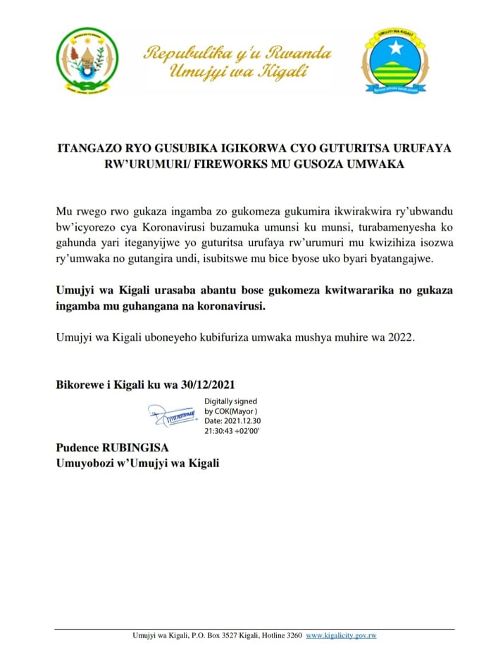 Ubuyobozi bw’Umujyi wa Kigali bwahagaritse igikorwa cyari cyateguwe cyo guturitsa urufaya ry’urumuri mu rwego rwo kwizihiza isozwa ry’umwaka no gutangira undi.Iki gikorwa cyari giteganyijwe mu ijoro ryo kuri uyu wa Gatanu tariki 31 Ukuboza 2021 mu bice bitandukanye by’Umujyi wa Kigali.