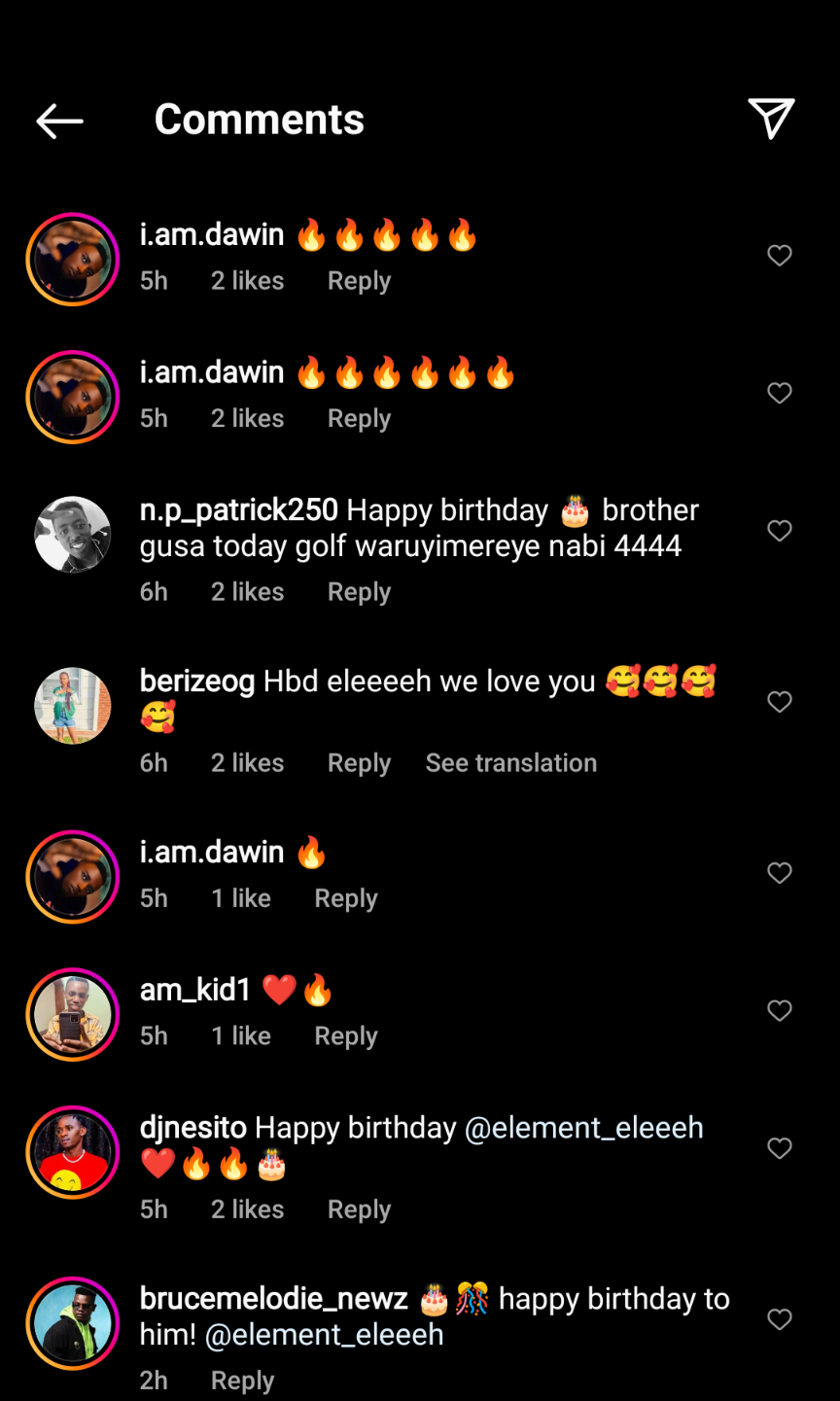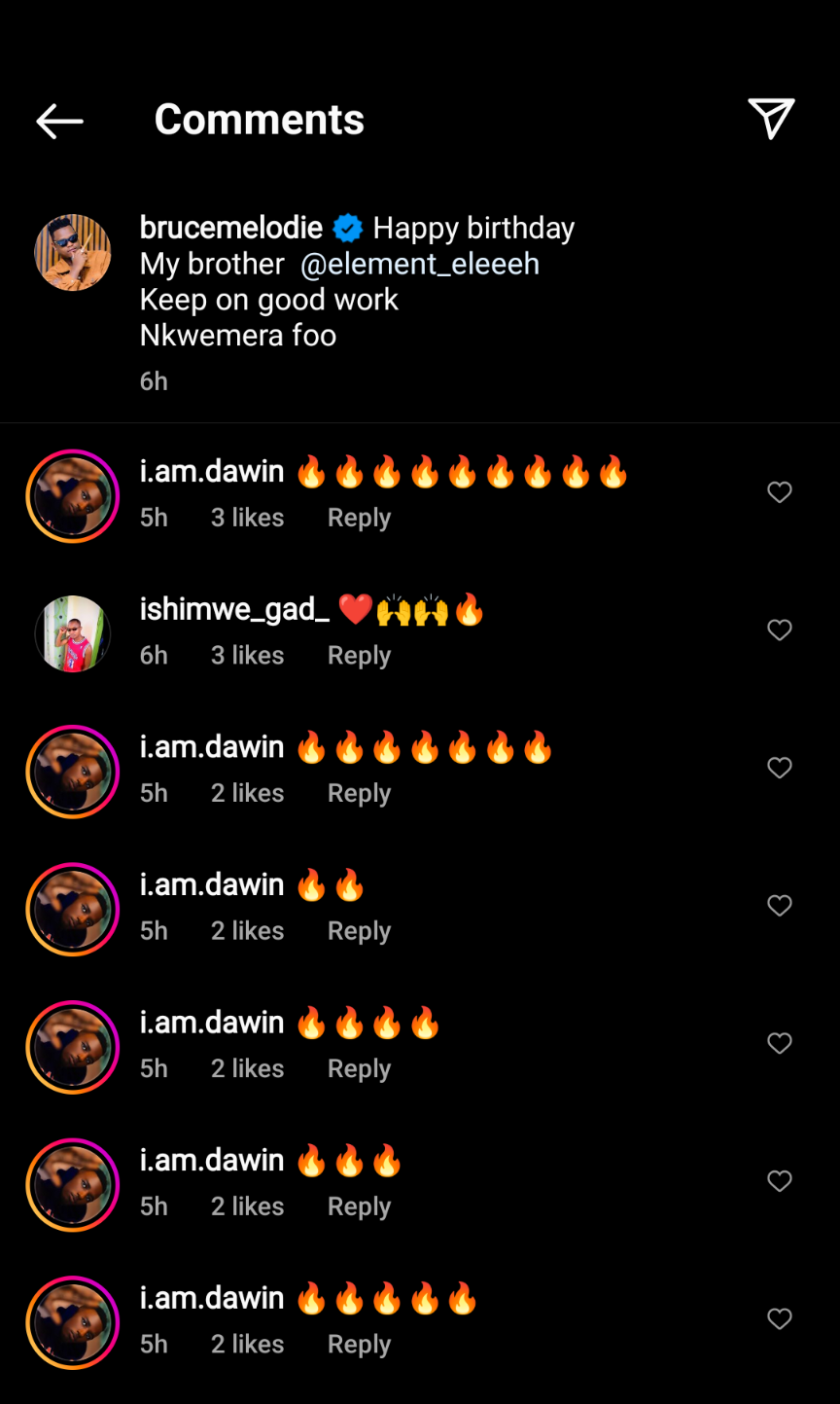 Ku munsi w’ejo tariki 25/07/2023 nibwo umuvangamiziki Element uri kwisonga mu Rwanda yagize isabukuru y’amavuko, Bruce Melodie basanzwe bakorana ibikorwa byinshi bitandukanye yifashishije imbuga nkoranyambaga ze maze yifuriza uyu musore isabukuru nziza y’amavuko.
