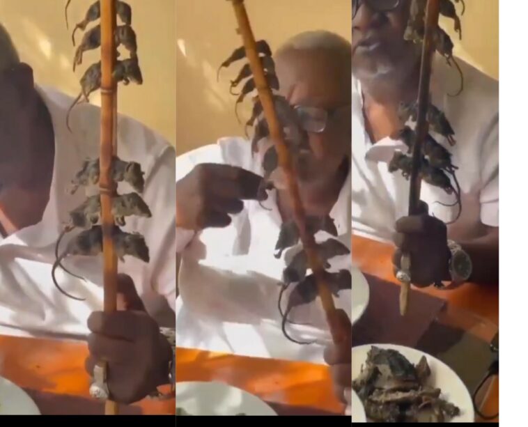 Mu mashusho yacaracaye ku mbuga nkoranyambaga zitandukanye yagaragaje umugabo wari kurya ubugari afite n’igiti cyuzuyeho utwana tw’imbeba ndetse n’imbere ye hari isahani yuzuye utwana tw’imbeba kandi ubona ko apeti ari yose.