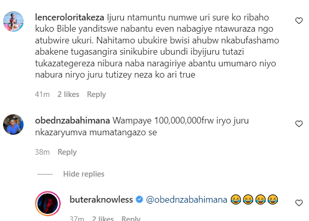 Knowless yagize ati “waguhitishamo Kuguha Ubutunzi Bwose Kw’isi Wifuza, Ariko akakubwirako bishobora kugutera kUtazabona Ijuru. No kukubwira ko wemera Ukababarira mwisi Muburyo bukomeye ugahura nibibazo, Birimo ubucyene, nibindi Ariko Ko Kwiherezo Uzajya Mw’ijuru Wahitamo Iki? Ese Ubundi wemera ko Ijuru ribaho? Ese ubona Hari Abazarijyamo Nabatazajyayo? 🤔🤔”
