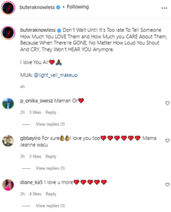 Mu rurimi rw’icyongereza yagize ati “Don’t Wait Until It’s Too late To Tell Someone How Much You LOVE Them and How Much you CARE About Them, Because When There’re GONE, No Matter How Loud You Shout And CRY, They Won’t HEAR YOU Anymore. I love You all”