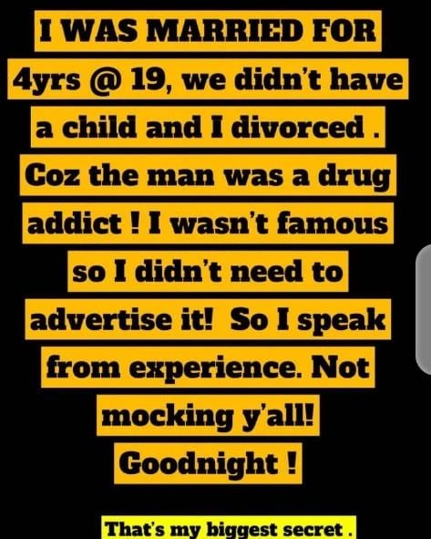 Uyu mukobwa yavuze ko ubwo yari afite imyaka 19 yabanye n’umugabo mu gihe cy’imyaka 4 bakaza gutandukana nta mwana kubera ko uyu mugabo yari yarabaswe n’ibiyobyabwenge, ibintu bitari byarigeze bimenyekana mu mateka y’ubwamamare bwe habe na rimwe.