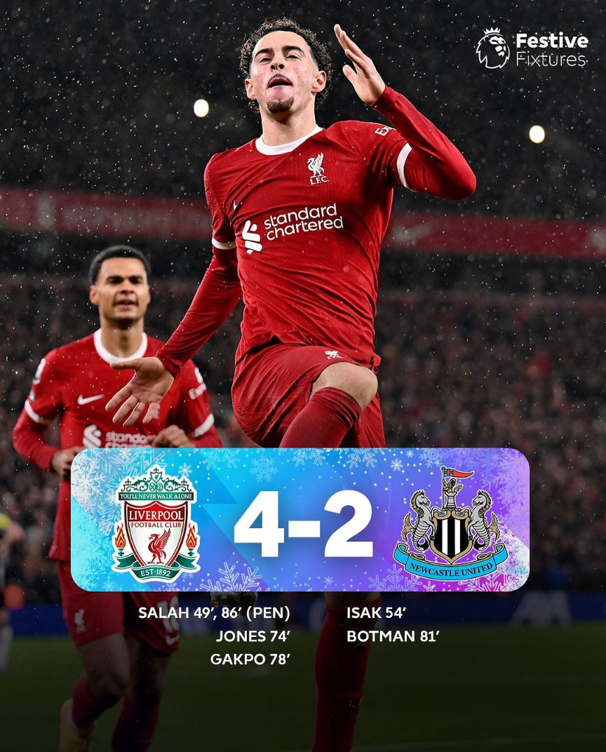 Rutahizamu w’ikipe ya Liverpool FC akaba umukinnyi ukomeye cyane w’ikipe y’igihugu ya Misiri (Egypt) Mohamed Salah mu ijoro rya cyeye yaraye yigaragaje ku rwego rwo hejuru afasha ikipe ye ya Liverpool FC gutsinda Newcastle united ibitego 4-2 byatumye ikaba umwanya wa mbere muri Premier League n’amanota 45 ikaba ikurikiwe na Aston Villa ifite amanota 42.
