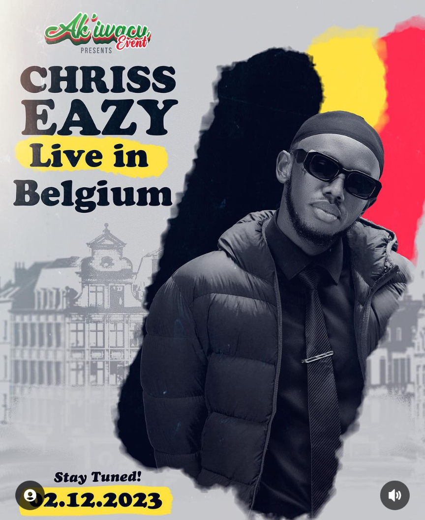 Umuhanzi Rukundo Christian wamamaye cyane ku izina rya Chris Eazy yifashishije imbuga nkoranyambaga ze yatangaje ko tariki 02/12/2023 azajya gutaramira abantu batuye mu Bubiligi.