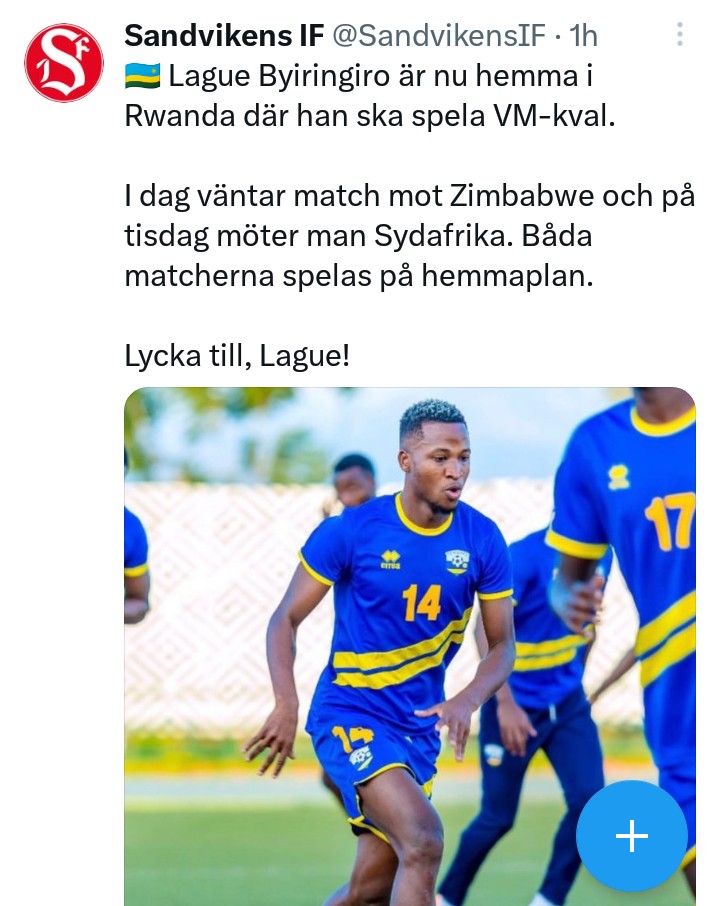 Sandviken IF ibinyujije ku mbuga nkoranyambaga zayo, yagize iti “Lague Byiringiro ubu ari murugo mu Rwanda aho azakina amajonjora yo gushaka itike yo kuzakina igikombe cyisi.