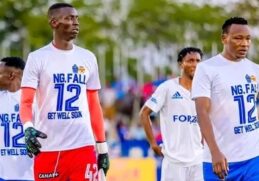 in imikino Abakinnyi ba Rayon Sports baje bambaye imyenda iriho ubutumwa bugaragaza ko bifatanyije na rutahizamu Fall Ngagne utazongera gukina muri uyu mwaka w’imikino – AMAFOTO