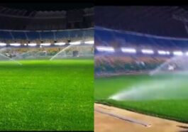 in imikino Ubwatsi bw’ubukorano bugezweho bwashyizwe muri stade Amahoro, batangiye kubutera amazi, bisanzwe bikorwa nko muri stade z’iburayi – VIDEWO