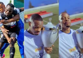 in imikino Ifoto y’umunsi: Umutoza wa Rayon Sports yahamagaye umugore we maze amwerekana imbere y’imbaga y’abafana ba Rayon Sports bari bari kwishimira igikombe bambuye APR FC (Ifoto bateruranye igikombe)